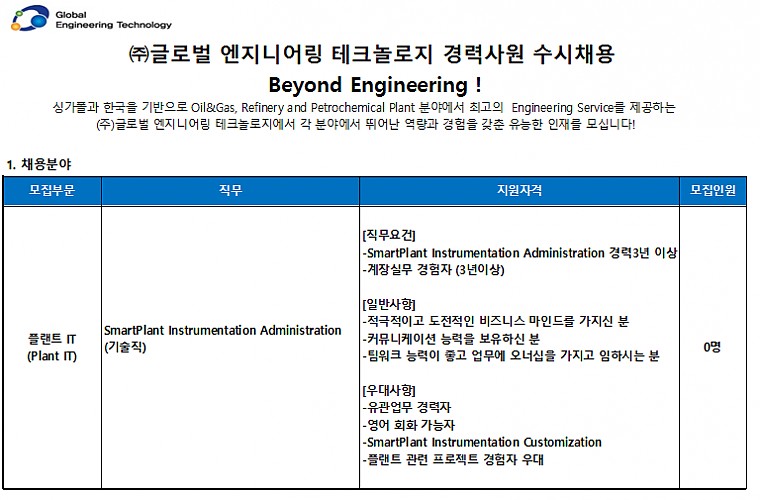 2015년 9월 경력사원 (플랜트 IT 부문) 페이지 정보 Writer GETech Date15-09-07 15:35 Hit1,222 comment0 Prev Next List 본문 2. 공통 응시자격 (1) 4년제 대학교 졸업자 (2) 해외 여행의 결격 사유가 없는 자 (3) 남자는 병역필 또는 면제자 (4) 외국어 능력 우수자 우대 [영어, 러시아어] (5) 관련 자격증 소지자 우대 (6) 장애인 및 보훈대상자 우대 3. 채용방법 서류전형 → 면접전형 → 처우협의 → 입사 4. 제출방법 홈페이지 접수 5. 접수기간 채용 시 까지 6. 문의사항 ☞ 인사팀 채용담당 : recruit@getech.com.sg Comments List Registered comments Not available Prev Next List